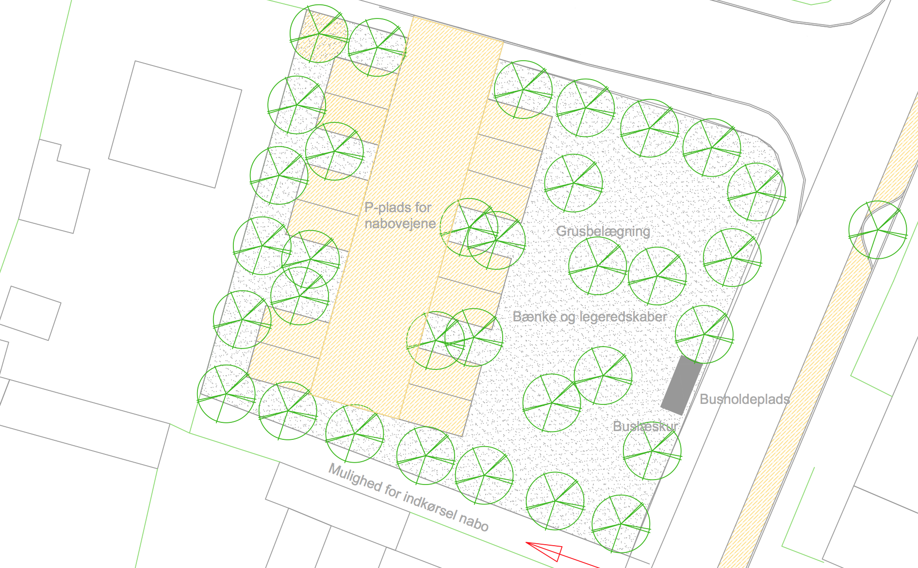 Parkeringspladsen Indretning som er bygget op omkring en ramme af store markante træer. Ca. halvdelen af pladsen… Parkeringspladsen